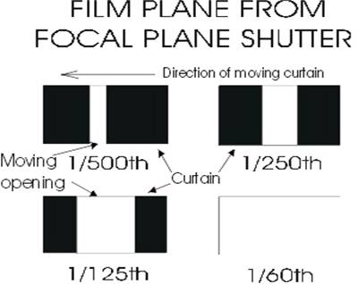 The curtain has an opening allowing light to pass, and as this opening zooms across the focal plane it exposes the film. Each shutter speed exposes a different amount of the film as the curtain zooms across the film plane. At higher shutter speeds (1/500th, 1/250th ), only a portion of the film is being exposed to light at any one instant as the opening in the curtain moves across the film. If an electronic flash fired in conjunction with a fast shutter speed, the light from the flash would only expose that portion of the film that the curtain opening was revealing that instant. At slower shutter speeds (1/60th and below), the focal plane shutter exposes the entire frame. Therefore, with slower shutter speeds the entire film plane area is exposed at once, because the opening in the moving curtain at these slower speeds is large enough to do so. When the flash fires, its light exposes the entire frame.