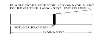After taking this hypothetical photograph under the above-mentioned settings, we find that our bird is properly exposed but badly blurred, just as suspected. We did not use an electronic flash. This entire hypothetical photograph was exposed only with ambient light. Our goal is to not allow the ambient light to record any of the flying bird. We want only the electronic flash to provide enough light to properly record the bird on our film.