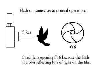 Every time you change the distance that your manual electronic flash is away from your subject, you must also make an f-stop adjustment on your lens. These f-stop adjustments are necessary because the closer the flash is to your subject, the more light will be reflected from your subject to your film. In such a case, in order to keep your subject from receiving too much reflected light from your flash (over exposed), you must set the lens to a smaller f-stop like f/16.