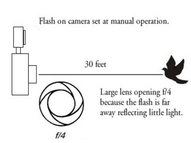 The farther away your manual electronic flash is from your subject, the less light will be reflected from your subject to your film. In such a case, in order to allow your film to receive enough reflected light from your subject, you must set the lens to a larger f-stop like f/4.