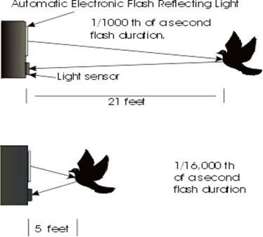 At a 21 foot distance between the subject and flash, the automatic electronic flash fires and reflects its light from the subject back into the light sensing unit of the flash’s computer where the intensity of the reflected light is measured. The sensor receives and measures both the ambient sunlight and the light from the electronic flash. The computer allows the flash to remain on until enough light is reflected from the subject onto the film to take a properly exposed photograph, after which, the sensor shuts off the flash. At a distance of 21 feet, the flash used in this example would stay on for a duration of 1/1000th of a second.