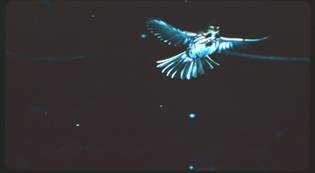 Some newer cameras with a built in flash measure the reflected flight from the flash internally through the camera lens instead of externally through a separate sensor on the flash. These internal camera sensors should be just as accurate and capable of controlling the duration of the flash exposure as the external sensors are. If such a camera is fully automatic, it will select a shutter speed of between 1/60th and 1/125th of a second because its focal plane shutter requires this with electronic flash just as does the recommended manually operated camera. Because such a slow shutter speed will provide too much reflected light for our film, an automatic camera will, in this case, select a small lens opening like f/16 for exposure control. My, my, how nice. A fully automatic camera automatically selects both the shutter speed and f-stop we desire when placed in such an unusual situation as being a few inches away from a hummingbird. Things are working out nicely.